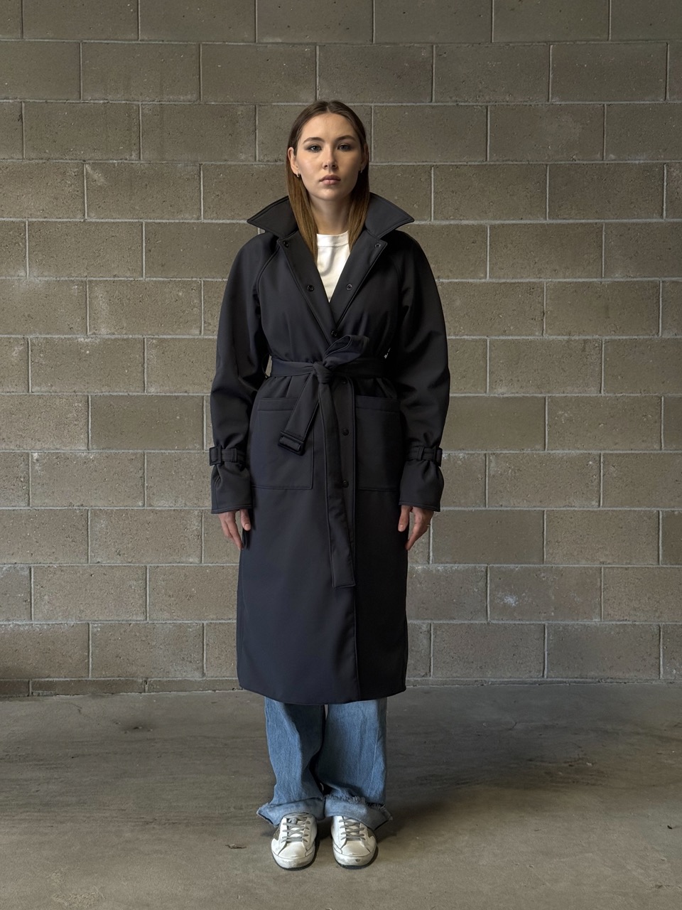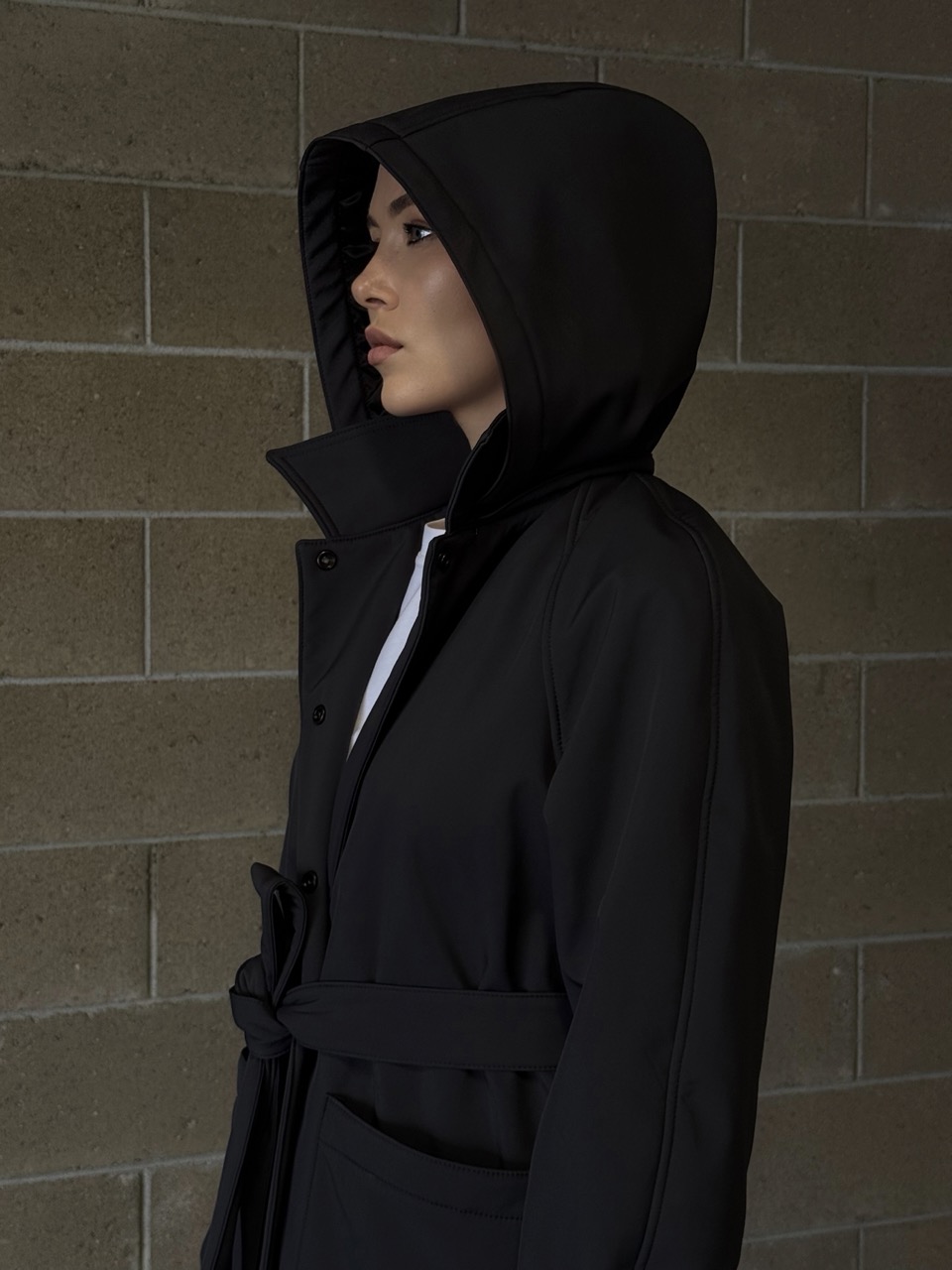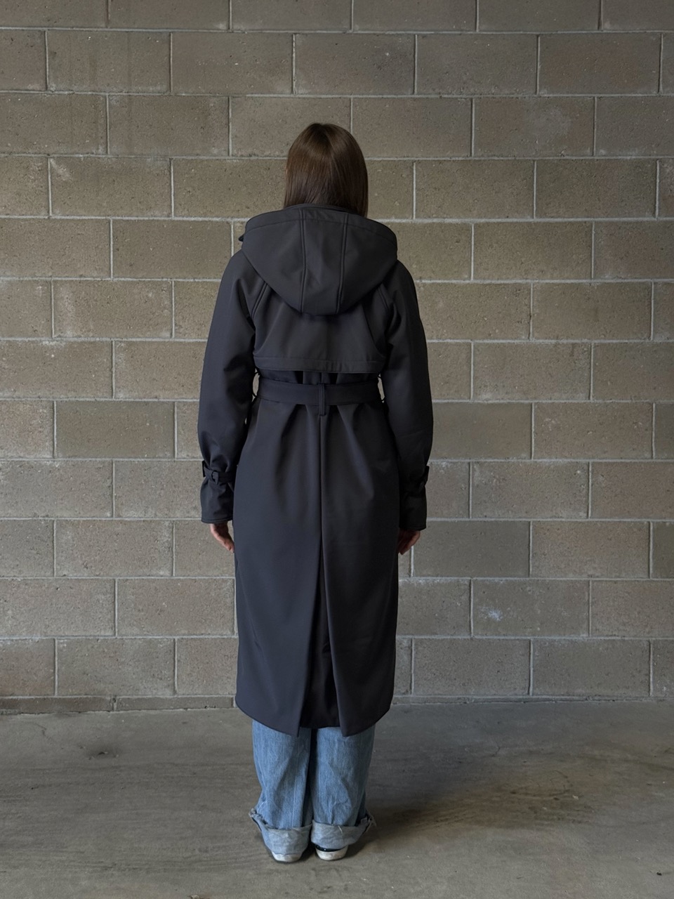 The trench coat is designed in a classic cut, with a back yoke and large pockets in the front. Uniquely, it has a zippered hood for convenience and usability in rainy weather, and its main feature is its softshell material, which is very elegant and durable.