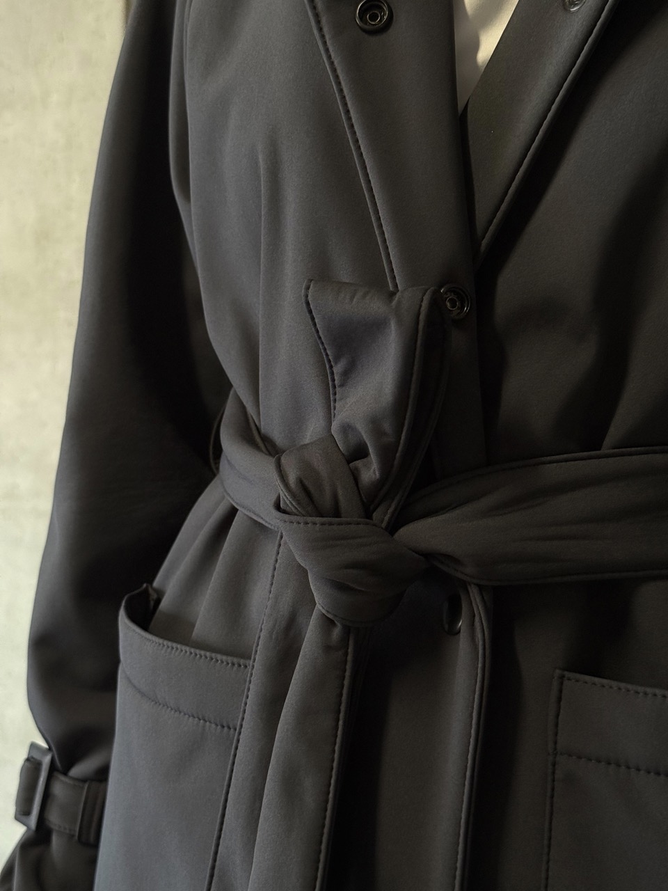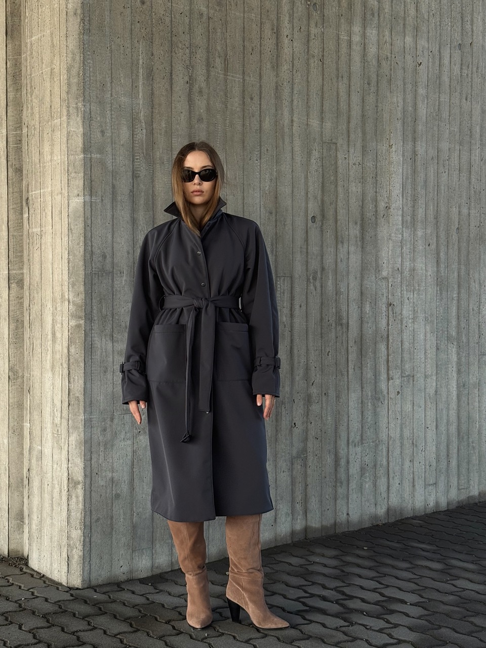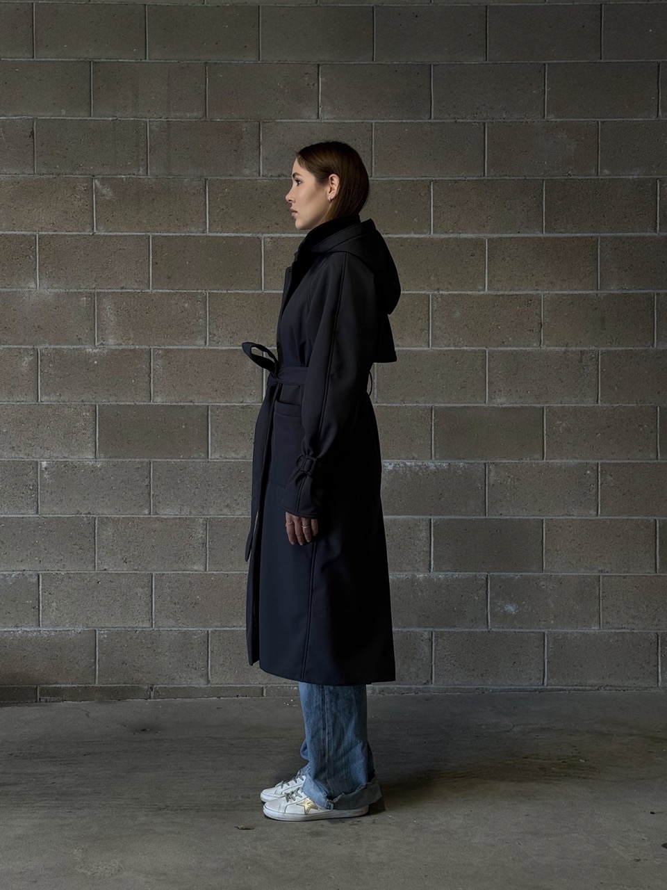 The trench coat is designed in a classic cut, with a back yoke and large pockets in the front. Uniquely, it has a zippered hood for convenience and usability in rainy weather, and its main feature is its softshell material, which is very elegant and durable.