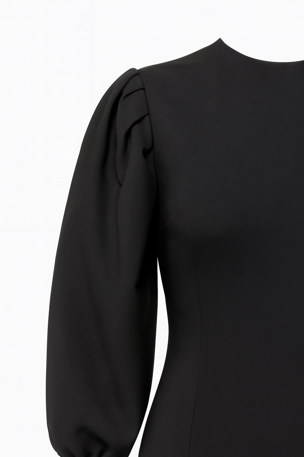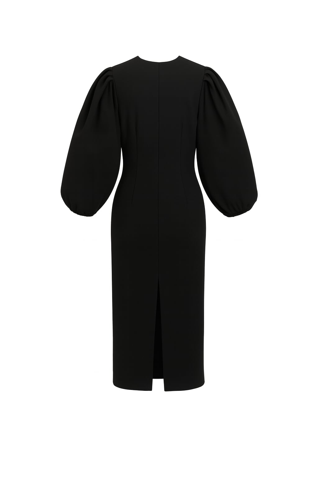 Midi length, pleated sleeves, waist darts, hidden back zipper, a vent.